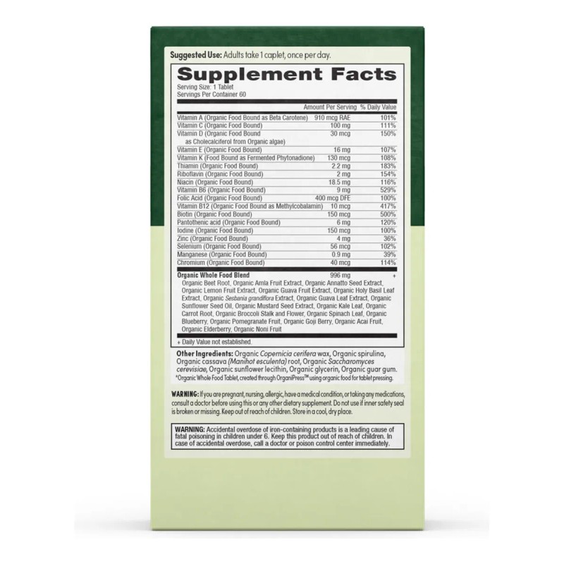 - Tecnología Orgánica Food Bound: Ingredientes reales que transportan y entregan vitaminas y minerales en forma altamente biodisponible; Tecnología Tablet Limpia minimiza ingredientes inactivos