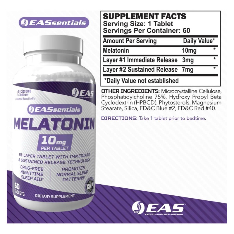 🛌 EAS Melatonina 10mg – Suplemento Natural para Dormir | 60 Tabletas | Apoyo al Sueño, Relajación y Ritmo Circadiano 🌙💤