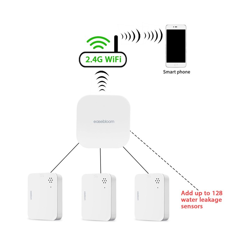 - 4.Easy Installation: Need to connect the gateway to 2.4GHz WiFi first, (not compatible with 5GHz). Then add a water leak sensor to the gateway. Place it near your toilet, washing machine, sink, water heater, or any place where water may leak. Place the water leak alarm on a clean, dry surface to minimise false alarms.