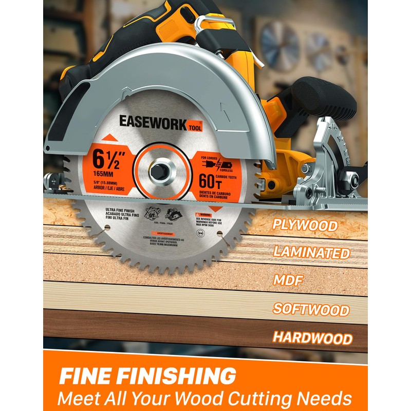 "Product DescriptionSpecificationEASEWORK circular saw blades 6-1/2 inch, 60T, 5/8"" arbor, Max 9000 RPM, clockwise Rotation.Clean & Crisp CuttingEASEWORK framing saw blades with sharp and tough carbide teeth perfect for fast wood cutting such as softwood, hardwood, laminate, plywood, chipboard, panels, FRP, MDF and wood with nails.Speed & Smooth CuttingGeneral purpose saw blades comes with special ATB teeth design, The alternating left and right teeth can achieve a more even cutting efficiency and a smoother cut, Perfect for construction wood, 2x4 pine, 2x4 poplar, 2x6 lumber.Heat & Noise ReductionFour holes around general saw blade helps to dissipate cutting and keeps the blades intact. Besides, it will reduce cutting noise, giving you a pleasant working experience."