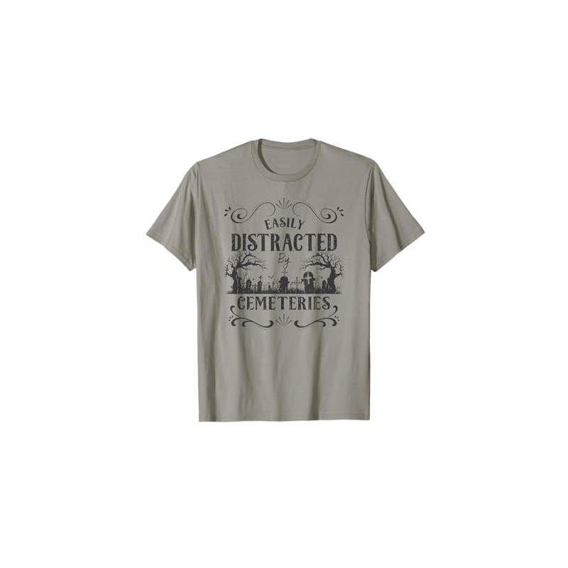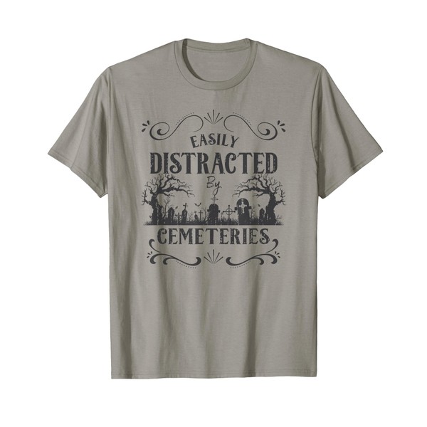 - “Easily Distracted by Cemeteries” distressed design is great for anyone who loves Halloween, old historic graveyards and reading epitaphs.