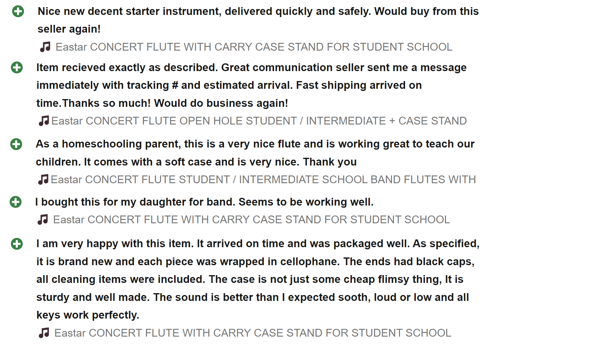 • BETTER PLAYING EXPERIENCE — With comfortable ergonomic offset G design easier to reach for beginners, and split E key for playing high E easily, the flute produces a pure and bright tone with accurate pitch and first-rate timbre. That's why school bands and music teachers choose Eastar.