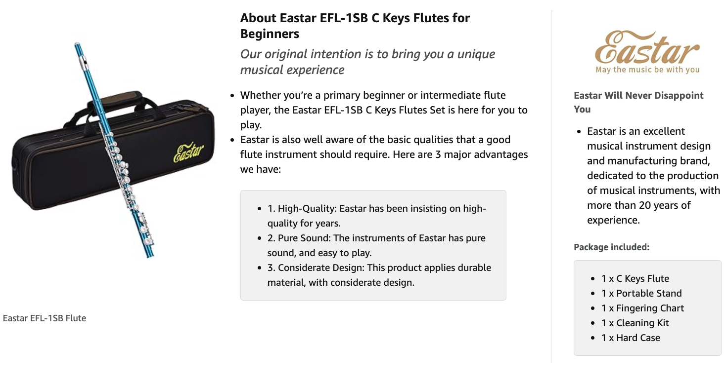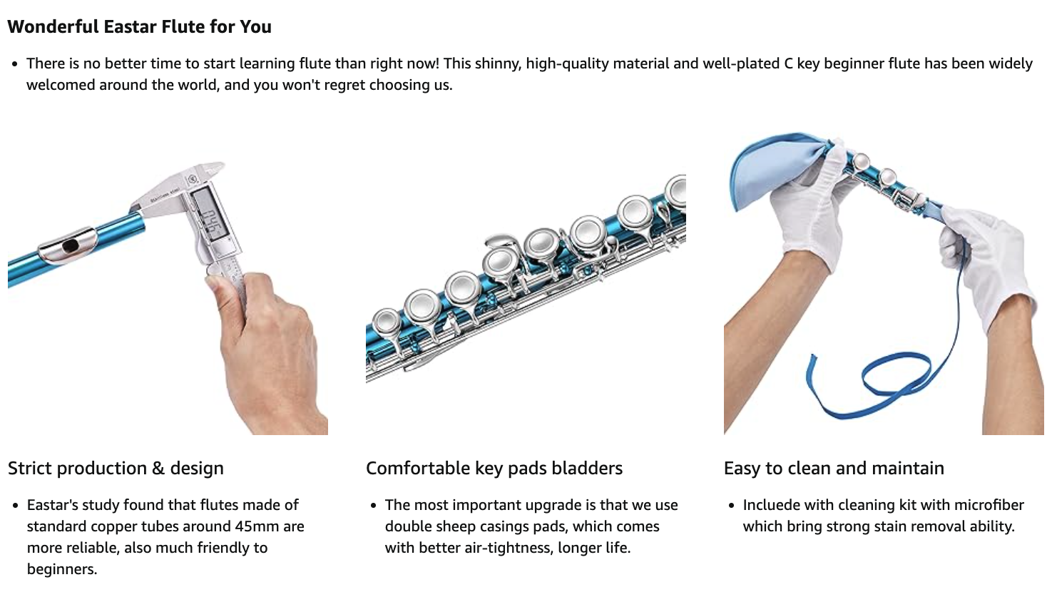 • EXCEPTIONAL CRAFTSMANSHIP — Eastar flutes are crafted and assembled by the hands of skilled artisans, each with years of experience and a meticulous attitude. From part processing, body carving and surface polishing, to the final assembly, each step goes through strict inspection for a high standard.