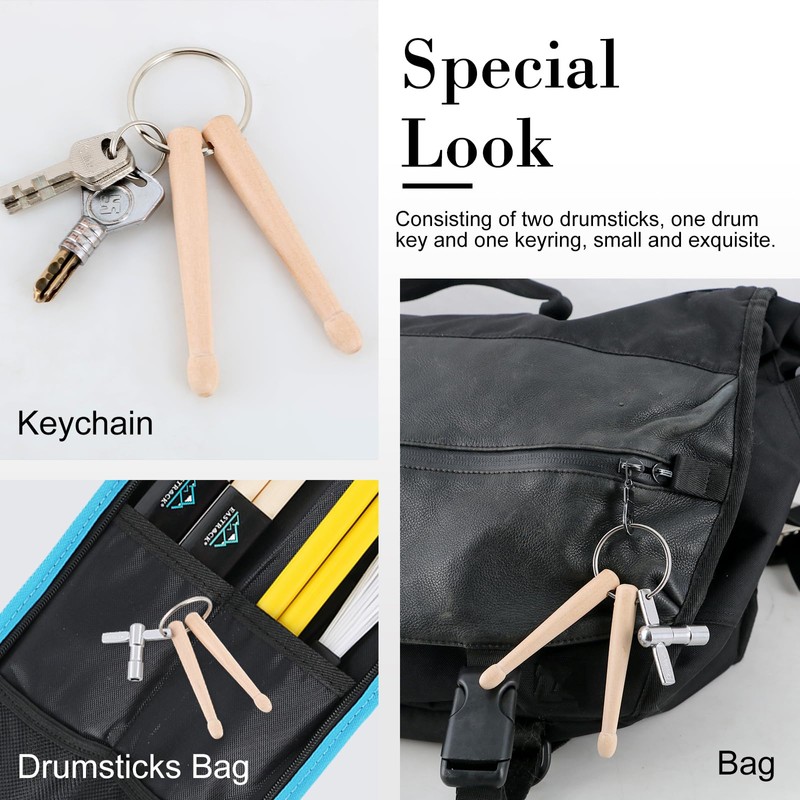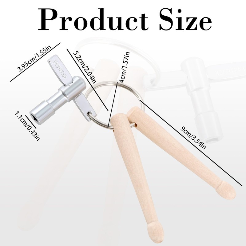 - Size: This drum key keychain features real double drumsticks approximately 3.5” in size. Consisting of two drumsticks, one drum key and one keyring, small and exquisite