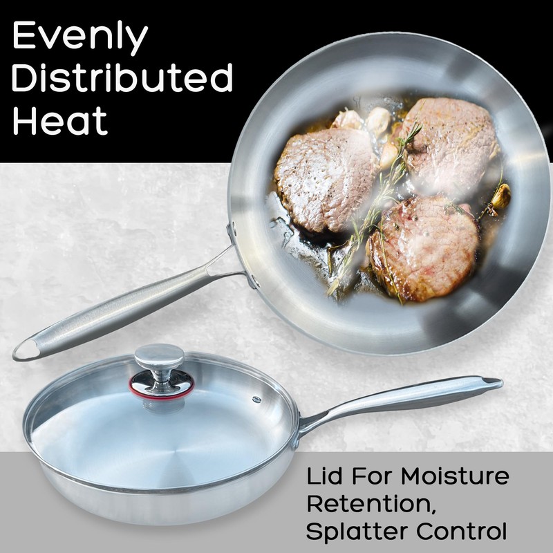 • 3 PLY HEAVY DUTY STAINLESS STEEL - Large 12" pan. 18/10 for superior quality.