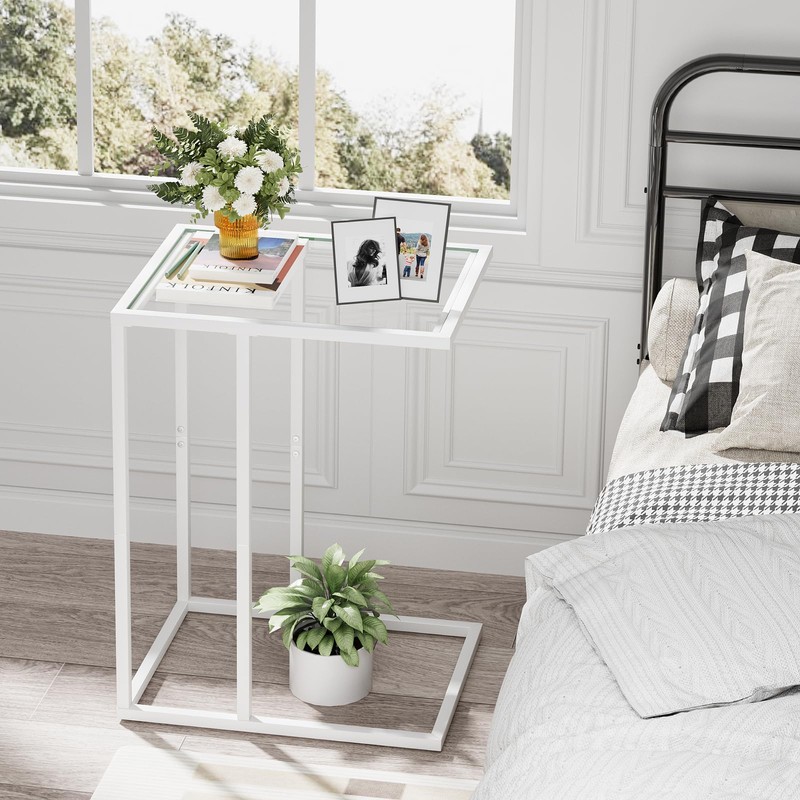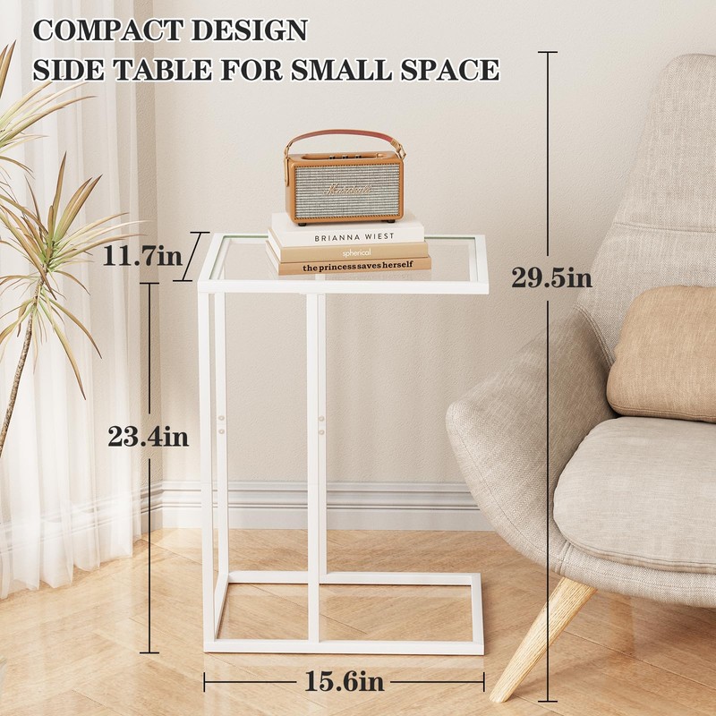 - [Made to Last] Glass end table is made with a robust steel frame and quality 5MM glass desktop and a powder-coated black metal frame, this C table for couches is durable enough to use years. Glass side table with simple yet elegant lines representing the current fashion trend.