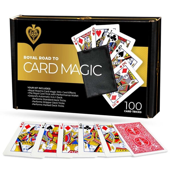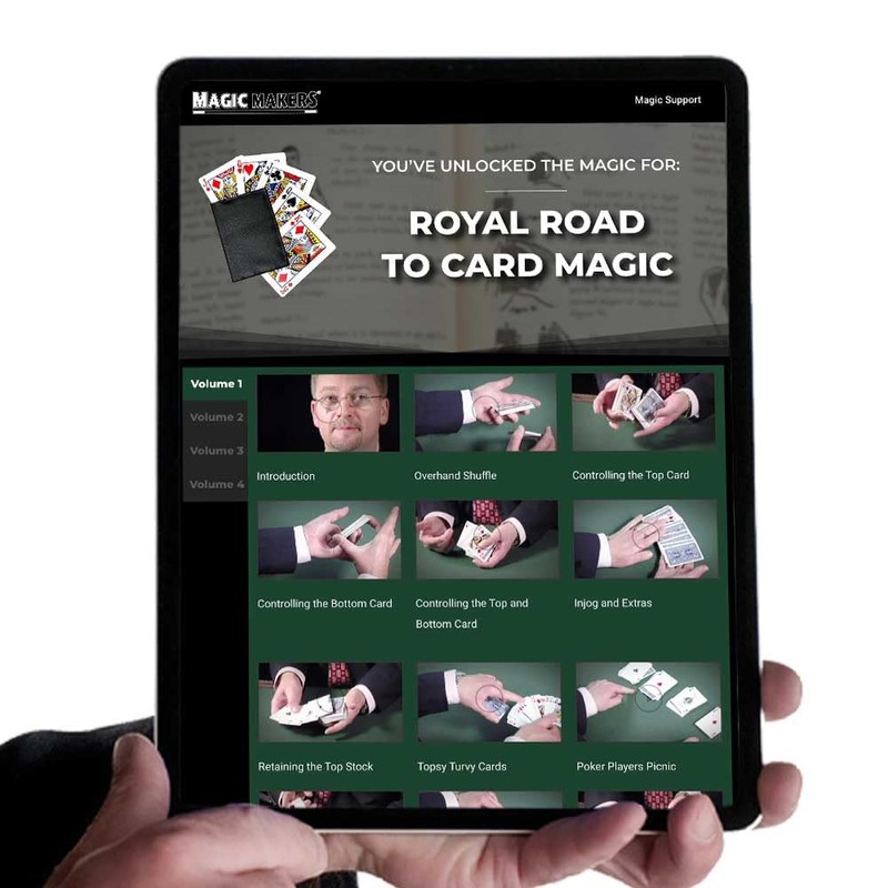 The Royal Road to Card Magic Deluxe Edition is THE classic card magic course! It includes knowledge that was originated by Frederick Braue and Jean Hugard. Rudy Hunter stars in this 4 volume set. In this Deluxe Edition you also get the De Lands Marked Deck! The ideas and design of this deck were created by Theodore L. De Land in the first decade of the 1900s. More than 100 years later De Land's marked deck and his other magical inventions continue to fool audiences...even the most skeptic observer. The deck contains a secret marking system giving you the ability to know a card without seeing it's face! The deck is also tapered (Stripper Deck) giving you the ability to control a card or groups of cards by touch alone; anywhere in the deck! To top it off this deck has yet another secret marking system giving you the ability to instantly name the location of any card! Whether you are a beginner or an expert or somewhere in between you will find over 100 new tricks! Armed with the incredible De Lands deck you will be unstoppable! "Royal Road is a classic in magic that every magician has started with! Now complete the experience and learn first hand from the best instructional videos on card magic. The Royal Road To Card Magic belongs on every magician's shelf." - Marty "Martini" Grams