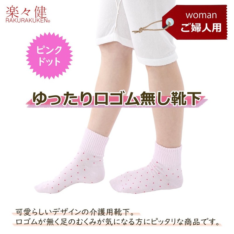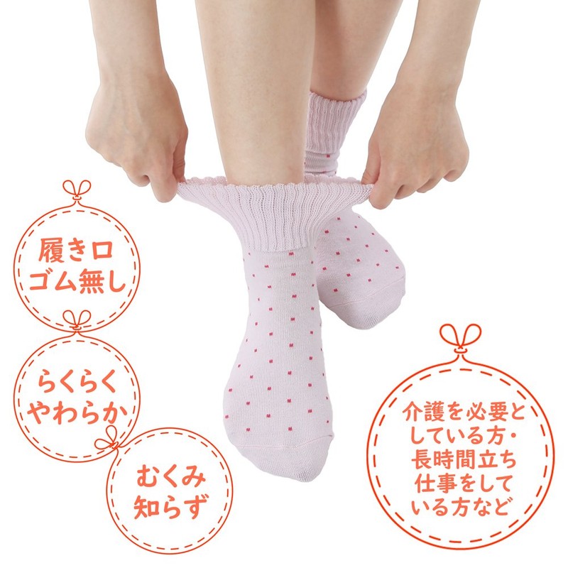 - 【商品内容】可愛らしいデザインの介護用靴下。口ゴムが無く足のむくみが気になる方にピッタリな商品です。