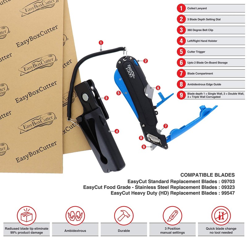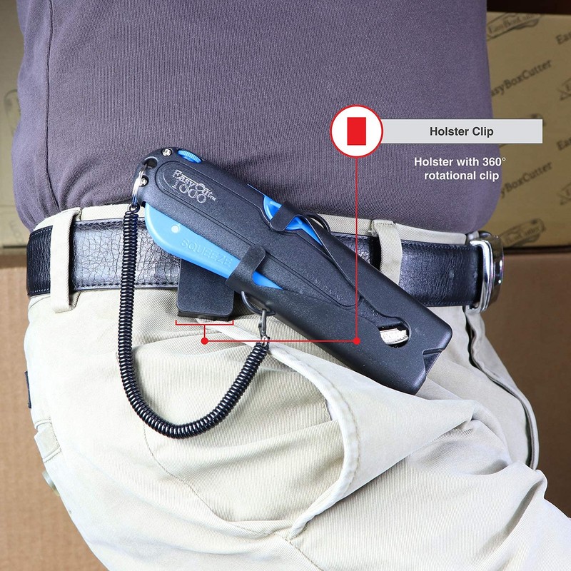 Ideal for opening single, double, and triple-wall boxes, Easy-Cut 1000 offers a patented radius-blunt tip blade and multiple depth settings to cleanly slice through cardboard boxes without causing damage to product inside – even something as delicate as a balloon! A gentle squeeze of the ergonomic handle extends the blade naturally, reducing repetitive thumb motion injury common with other box cutters. when the handle is released, the blade retracts inside the unit, unlike other devices where the blade remains in an extended position waiting for an accidents to occur. An edge guide enables left and right handed users to make quick, accurate top cuts – sliding back into locked position when the cut is complete. The unique snap-on lanyard and holster with 180-degree rotation ensure easy reach and secure placement on a belt loop – reducing injury and down time looking for lost cutters. The on-board storage compartment for back-up blades enables fast and convenient blade changes.