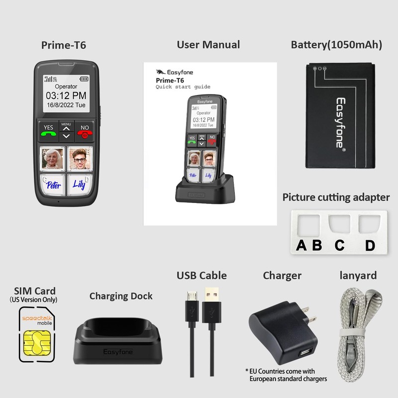 - User Friendly Accessories: Easyfone neck lanyard, Picture cutting adapter for buttons, Detailed user manual and Easy charging dock