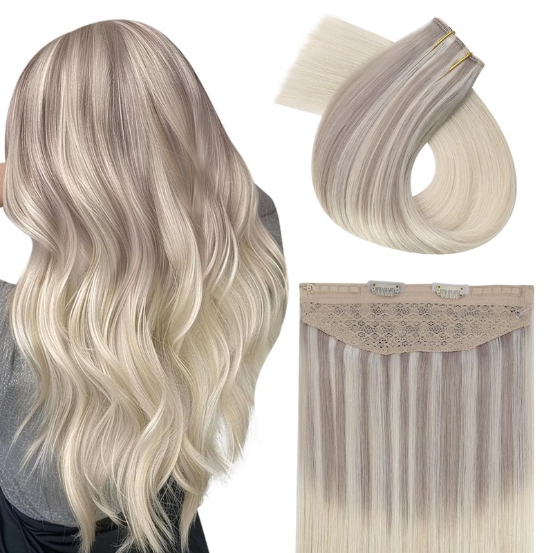 Easyouth Wire Hair Extensions Real Human Hair Hidden Fish Line Hair Extensions Balayage Ash Blonde Ombre Blonde Mixed Platinum Blonde Wire Human Hair Extensions Nordic 18inch 80g