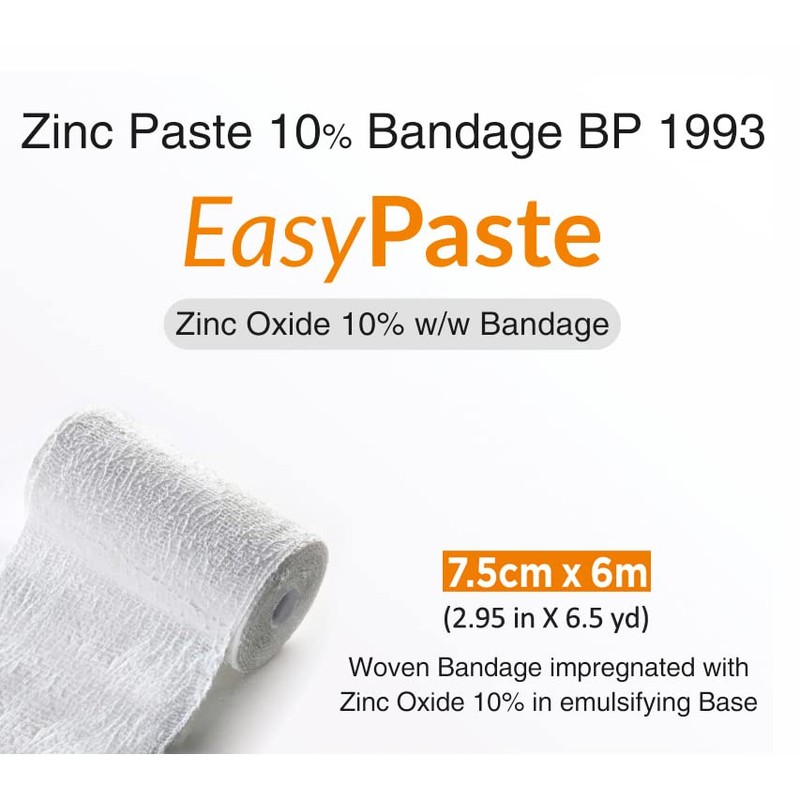 - EasyPaste is made of gauze bandage, uniformly impregnated with a paste containing 10% zinc oxide rolled onto plastic core. This bandage measures 2.95 inches wide and 6.5 yards (7.5cm x 6m) long bandages