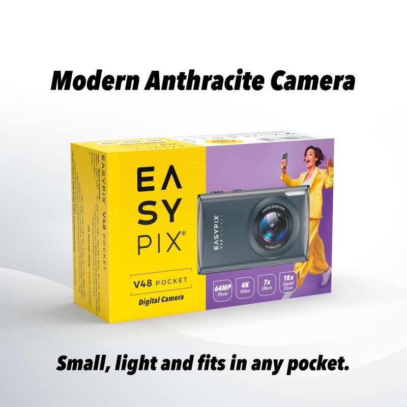 Easypix V48 Pocket Compact Digital Camera, 2.8" Display, Resolution up to 64 MP, 18x Digital Zoom, Anthracite