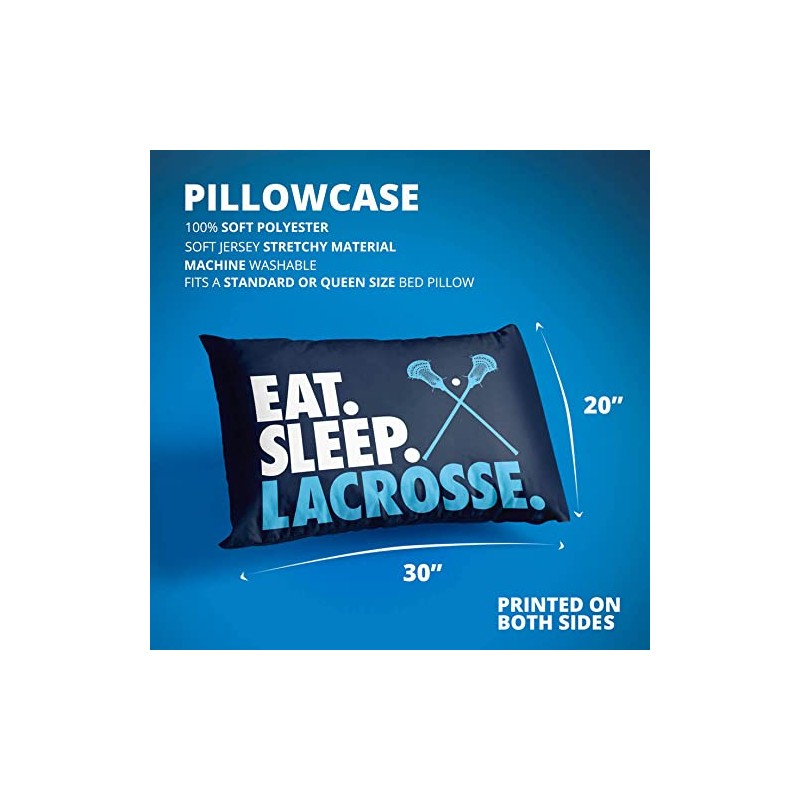 - COMFY AND COZY! This super comfortable guys lacrosse pillowcase is made from 100% soft polyester, allowing you to sleep like true rugger royalty the night before a big game! This Eat Sleep Lacrosse pillowcase measures 31" X 20" and fits a standard or queen size bed pillow. This awesome pillowcase is machine washable so that you can always keep it in great condition!