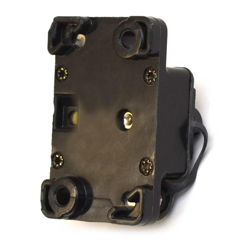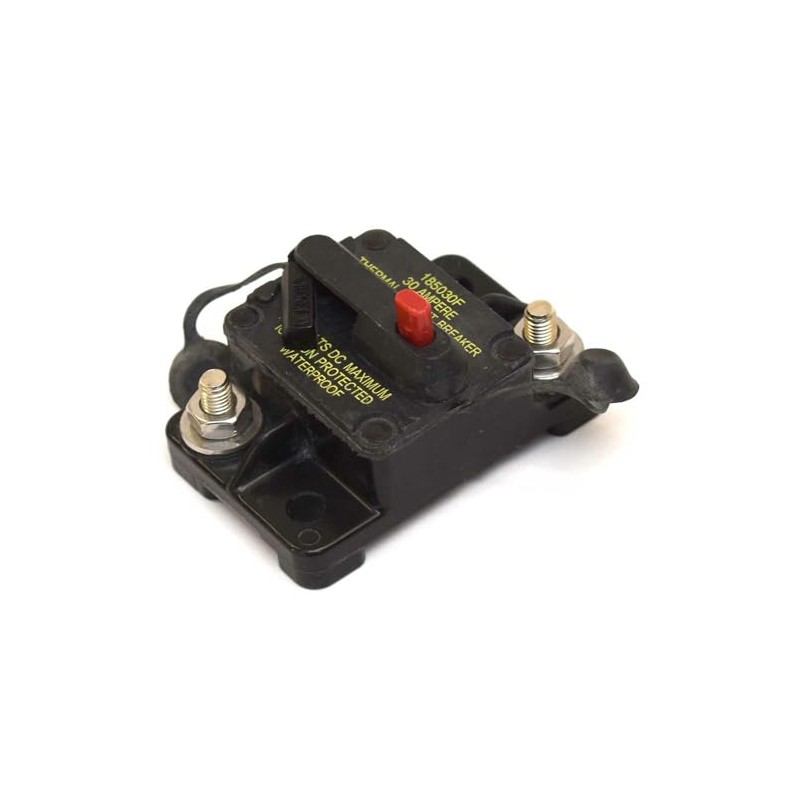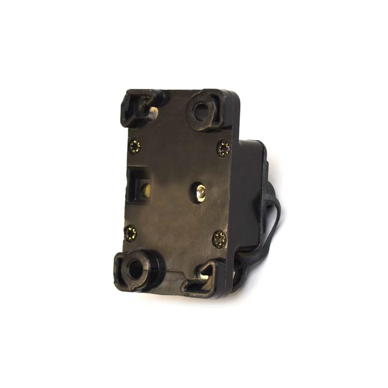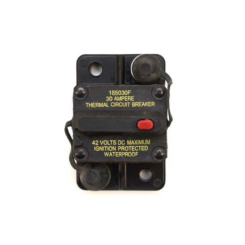 This manual & push-to-trip breaker is constructed out of black plastic and measures approximately 2 7/8" H x 1 7/8" W x 1 3/4" D overall. Connects with (2) 1/4"-28 terminals. Rated for 30A , 42V DC maximum. Mounts with (2) 1/4" Dia. mounting holes.