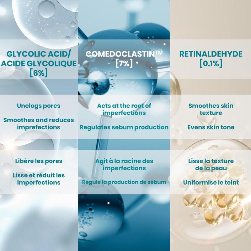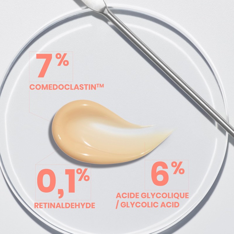 • Contains Glycolic Acid (exfoliates and stimulates cell renewal for a new skin effect thanks to its keratolytic action), Retinaldehyde (promotes the resorption of blemishes and the reduction of residual marks) and Comedoclastin.