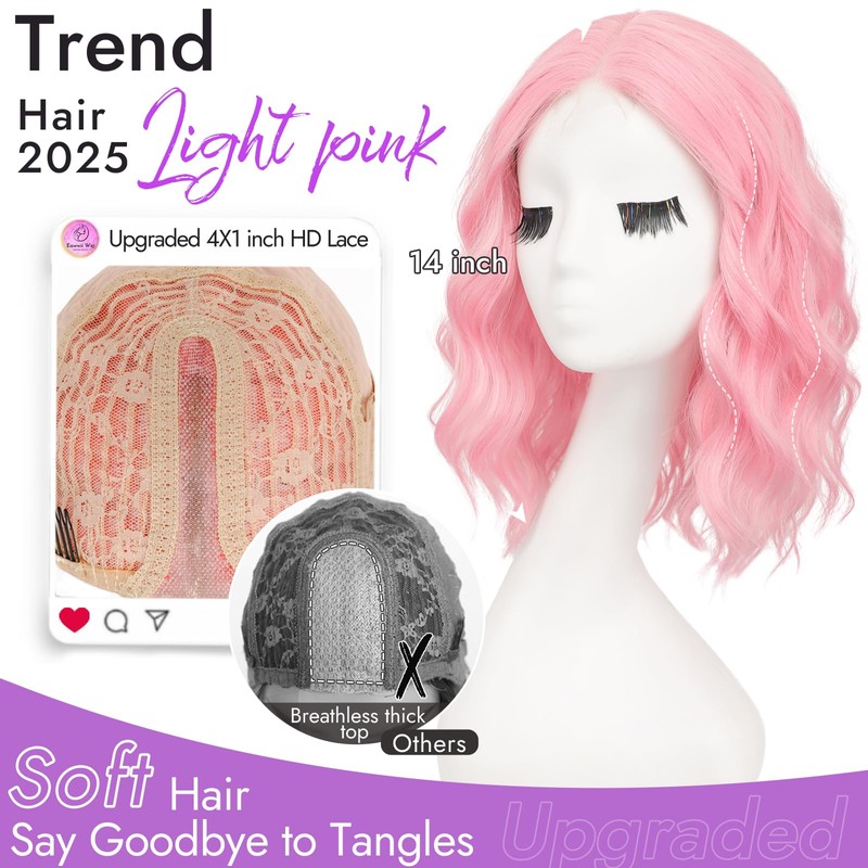 Eawwii Light Pink Short Wavy Wig for Women Lace Hairline Bob Style Synthetic Heat Resistant - Natural Appearance for Everyday Hairstyle 14 Inch