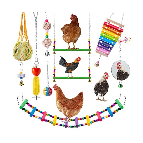 - Funny Chicken Toys: Super value set includes 1 chicken xylophone toy with bell, 2 chicken swing, 1 chicken ladder bridge, 1 chicken mirror toys, 3 chicken pecking toys, 1 Vegetable Fruit Skewer Hanging Feeder and 1 chicken veggies string bag. Any kind of chicken toys you want is available in the set.