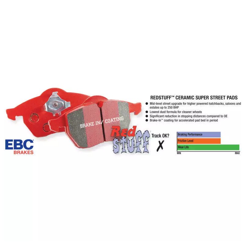 There are TWO reasons our customers love Redstuff, First because they are the lowest dust pad we have encountered by reducing dust by 60-90-percent. Plus the minimal dust you see is very easily removed with a simple sponge wash as it contains no steel fibre particles as in ALL OTHER pads. Second they brake like an alligator right from cold (as good as Original pads or better) and just get better as they heat up.This material is a Synthetic Fiber based brake compound enhanced with ceramic particles. If you have previously tried EBC redstuff (pre-ceramic compound) this material is light years ahead. It lasts longer; it brakes better and is quieter. Being a hard wearing pad, bed-in times can be as long as 1000 miles and drivers must be patient until the pad takes up the shape of their disc (brake rotor). This is a truly impressive fast road pad for repeated heavy braking.It emits far less dust than semi-metallic pads and has been proven to stop a passenger car/sedan/sport compact/hot hatch 13 metres quicker than OEM pads from 100mph/160kph. Features EBC Brake-In surface coating which conditions rotor surface and accelerates pad bed-in. Nominal friction coefficient 0.5 with approx. 50-percent dust reduction.Most EBC Red Ceramic pads are approved to ECE R90 brake safety regulation.This Part Fits: