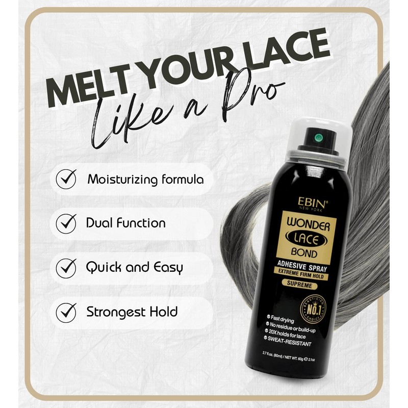EBIN Wonder Lace Bond Spray Wig Adhesive Supreme 2.7 oz by EBIN NEW YORK — Strong Hold, Sweat Resistant, Clear Finish— Lace Front Wig Spray Glue with Precision Nozzle for Seamless Application (1 Pack)