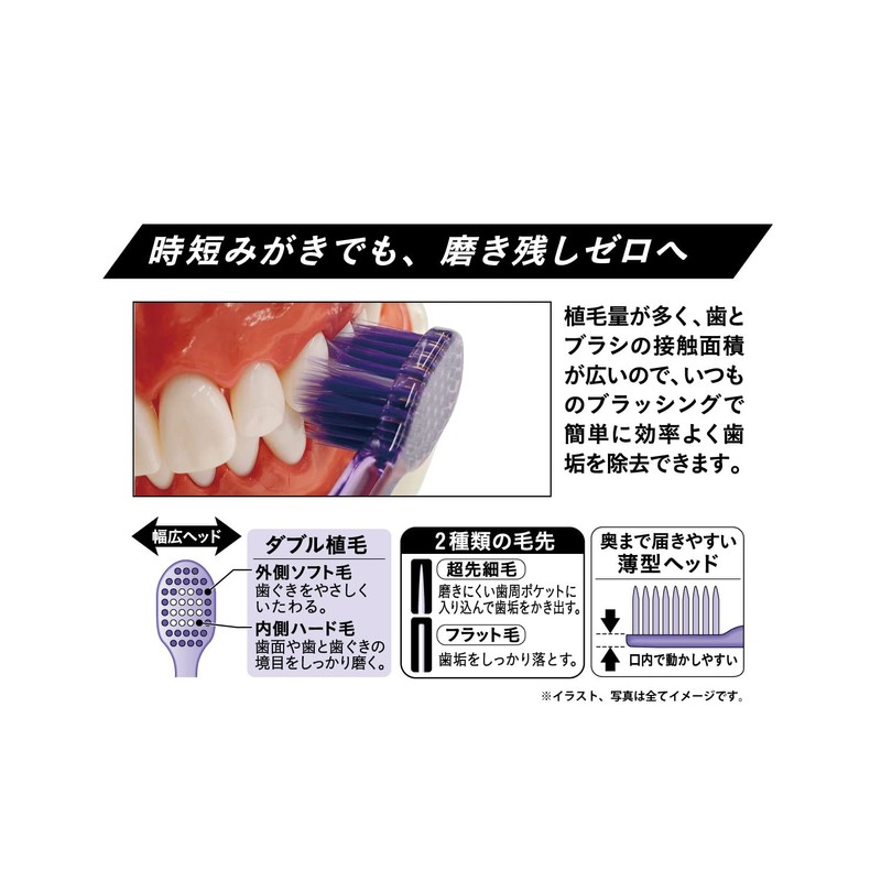 - Even if you have a short time burn, it will leave zero polish residue. With a large amount of hair planting, the teeth and brush contact area is wide, and the hair is easy and efficient to remove the plaque with regular brushing. The soft outer bristles gently massage gums and the inner hard bristles firmly polish the borders of teeth, teeth and gums. Double flocked hair. Periodontal care with 2 types of ends of ultra-fine and flat hair. Thin head reaches deep teeth Rich compact head for easy access in tight spaces