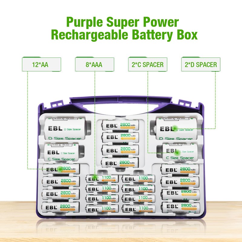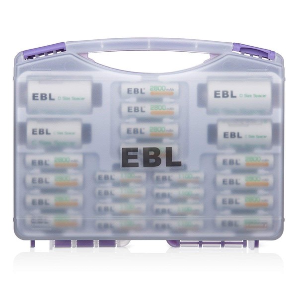 - EBL Power Packages: EBL Battery Organizer Storage Case included - EBL AA 2800mAh Rechargeable Batteries 12 Count, AAA 1100mAh Rechargeable Batteries 8 Count, 2 C Battery Adapter, 2 D Battery Adapters.