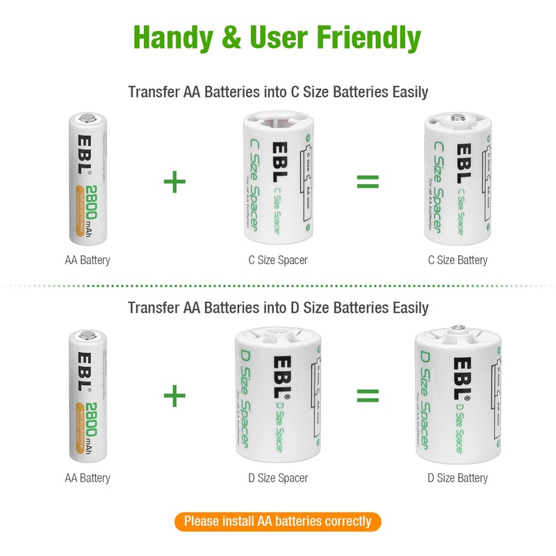 - C/D Size Adapters: EBL C size and D size spacers made from high quality, durable plastic, just put your AA batteries into spacers, then you will get C or D size batteries, very convenient to use.