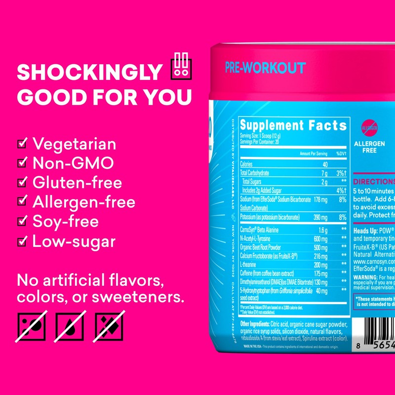 • Supercharge Your Performance: POW is a natural pre workout that enhances your mind and muscles to help you maximize your workouts. Work out hard and recover smoothly with ingredients in doses that deliver. Flavor: Blue Raspberry. 20 Servings