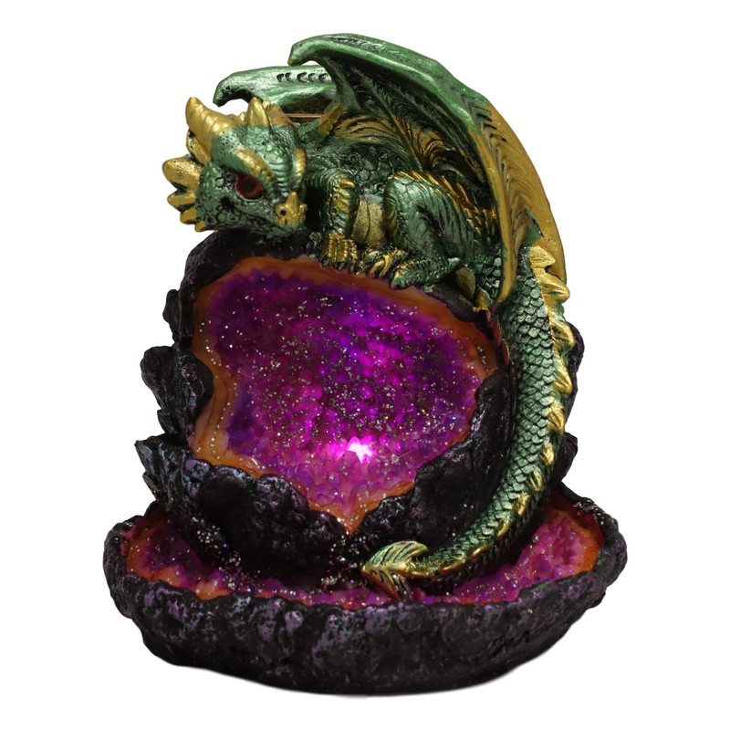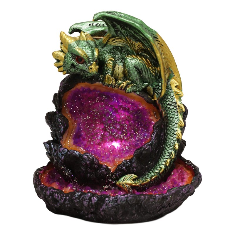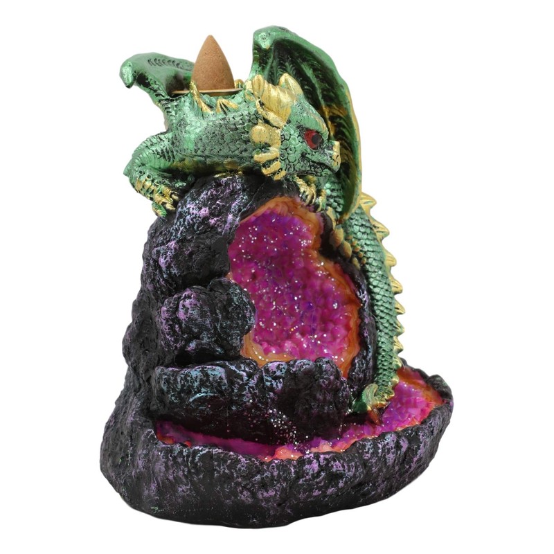 - This stunning incense burner will delight multiple senses, both smell and sight! A shining emerald dragon with gold accents perches atop a geode. The open gemstone glitters with purple crystals, and the smoke from the incense flows down to pool prettily in the faux-stone basin. A unique gift idea for the fantasy lover in your life!