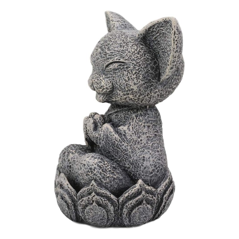 - Our special Jizo Cat Monk is sculpted in faux stone color resin. He is beautifully sculpted with a happy countenance, hands clasped together in prayer while sitting on a lotus flower. The lotus flower symbolizes humility and purity of body, spirit and mind.