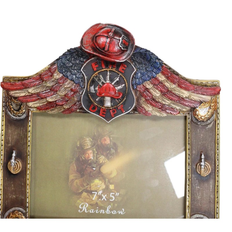 • This Fire Department Patriotic Picture Frame measures 9.75"High, 9.25" Wide and 1.25" Deep. It weighs about 2 pounds. Photo frame holds a 7" by 5" picture.