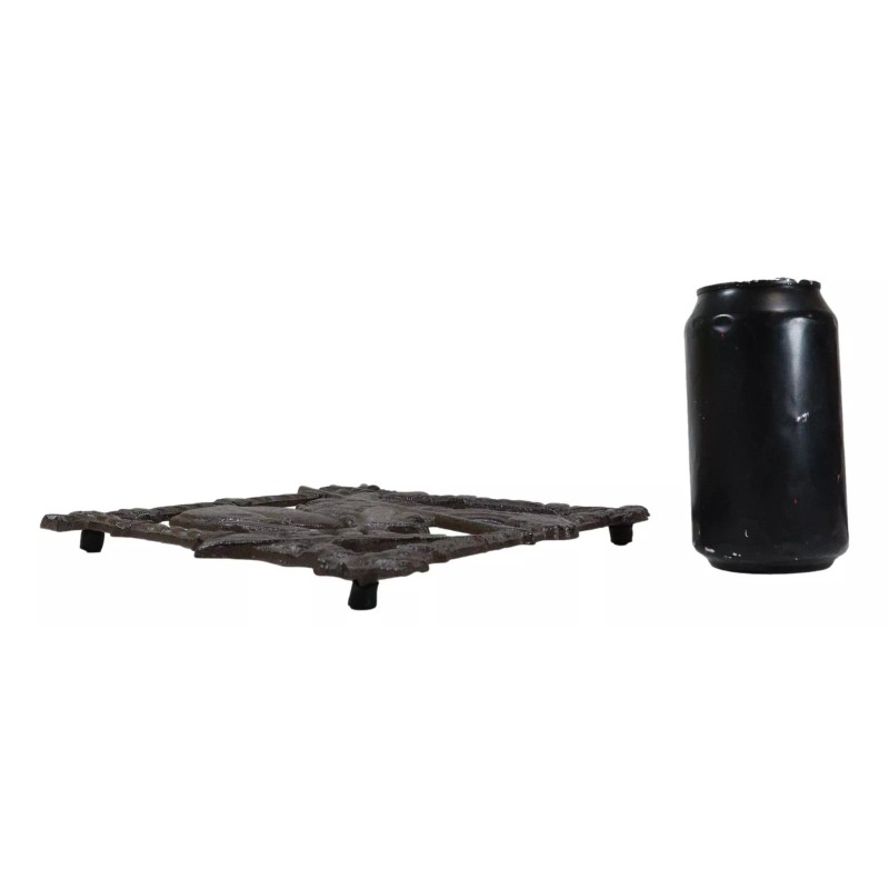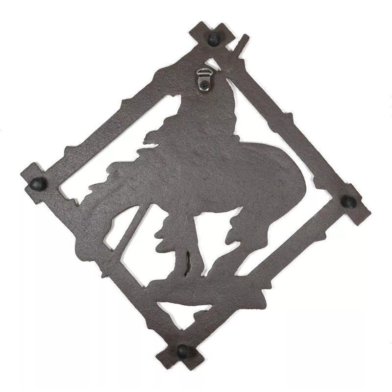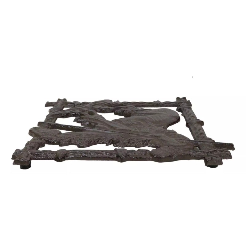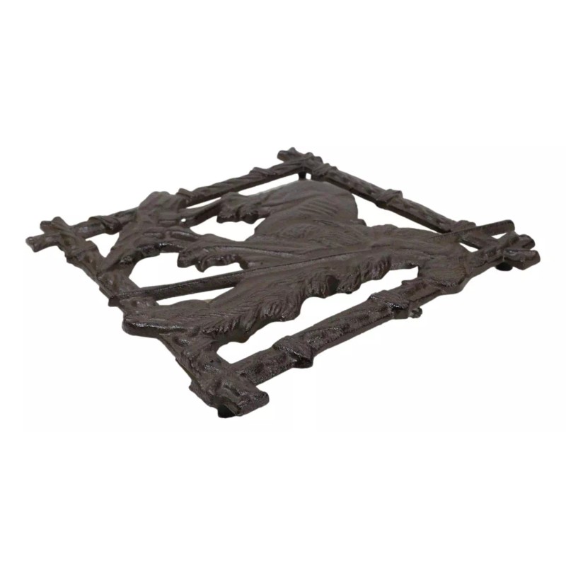 • This cast iron End Of The Trail trivet is a fashionable, functional way to keep your dining table or counters from getting heat damaged when hot pots are placed on them. It is equipped with rubberized feet on the bottoms to prevent scratches on your furniture. It can also be hung on a wall or placed on a shelf when not in use, as a decorative accent.