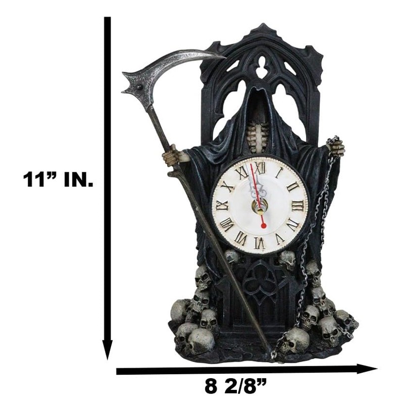 - This Grim Reaper Table Clock figurine is 11" tall, 8.5" long and 5.75" deep approximately. It weighs about 2.5 pounds.
