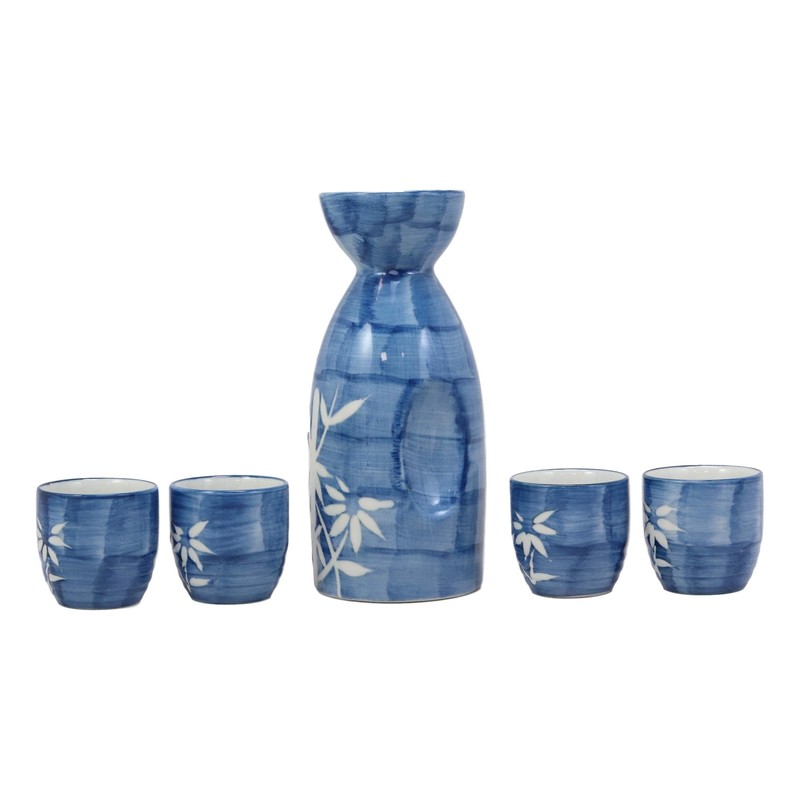 • This aesthetically eye pleasing sake set features textured ceramic porcelain glaze over blue 'brick' like background, with a beautiful winter white bamboo plants as the focal point of the earthenware. The combination of white lucky bamboo and the blue jeans color stacked brick like background make this sake set more than just a functional serveware set, but also as an elegant home decorative masterpiece.