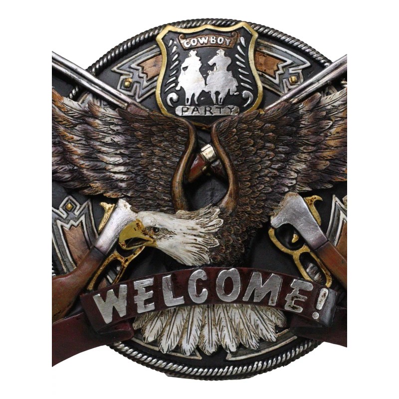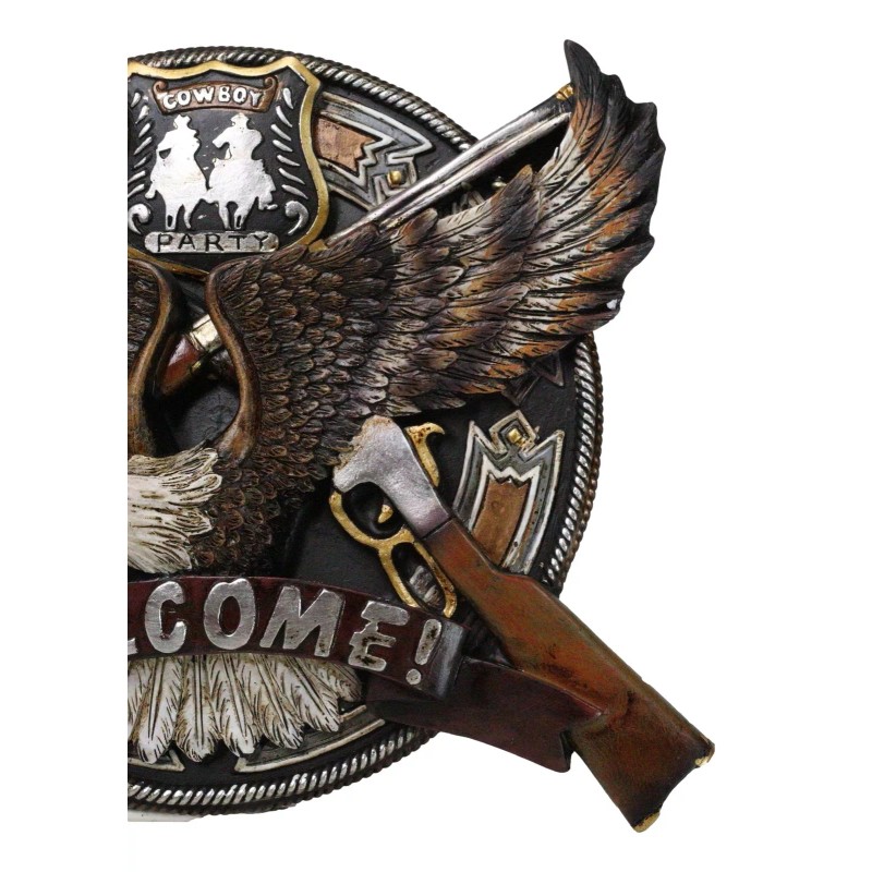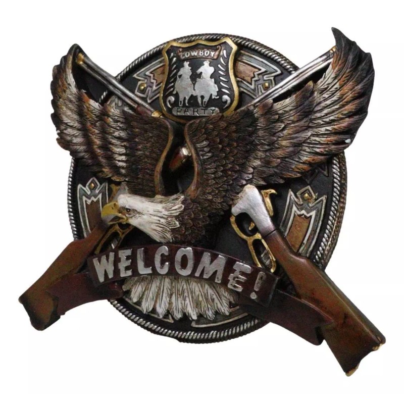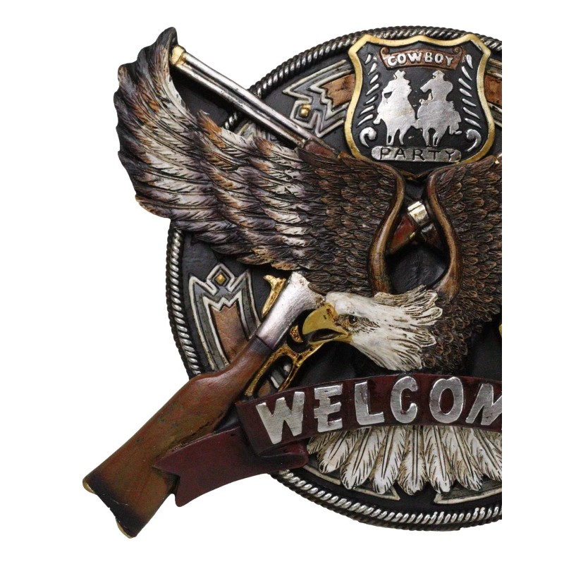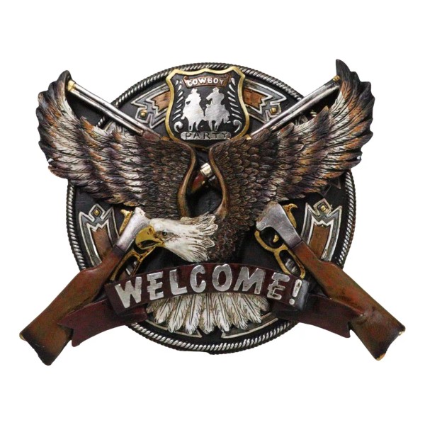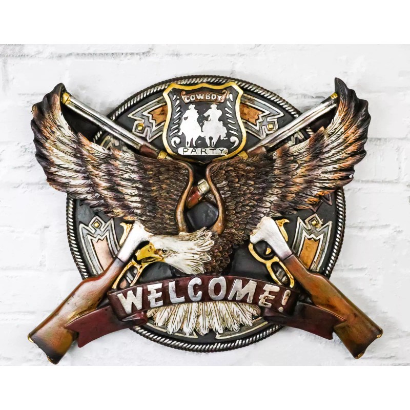 • Elevate your space with our striking Patriotic Bald Eagle Welcome Sign Wall Decor Plaque! Featuring a majestic bald eagle, two crossed rifle shotguns, and a vibrant 'cowboy party' badge, this piece combines rugged American pride with western charm. Crafted from high-quality materials, it offers both durability and timeless style, making it a perfect addition to any home, garage, or man cave.