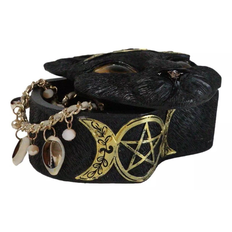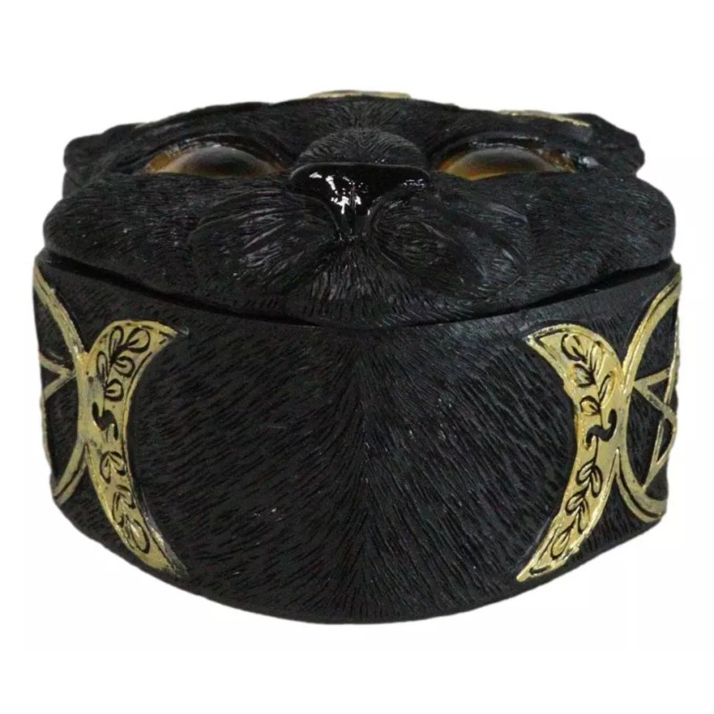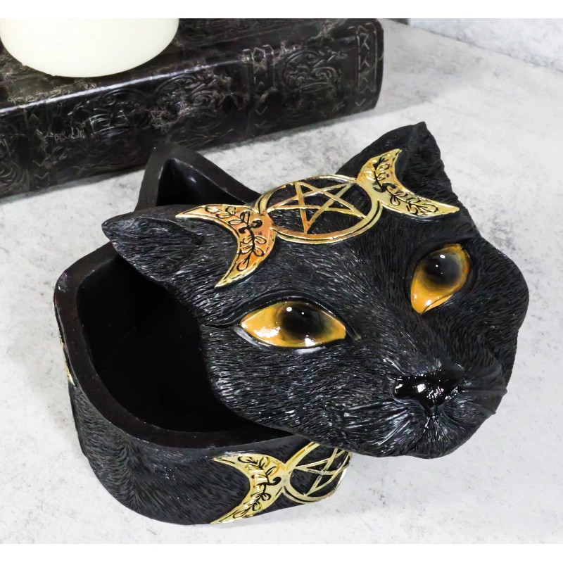 • Embrace the mystical energy of wicca with our Feline Black Cat Head Trinket Box adorned with the Triple Moon Symbol. This enchanting piece combines the mystique of black cats with the symbolism of the Triple Moon, creating a captivating and functional trinket box.