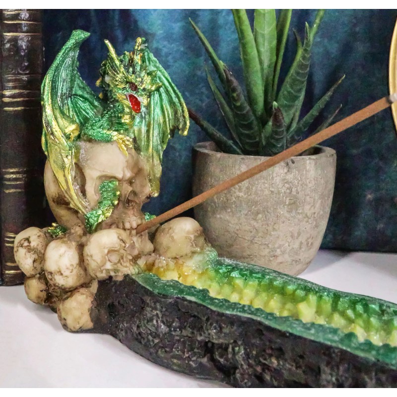 Ebros Green Dragon on Skull Stick Incense Burner 10.75" Length Functional Decor