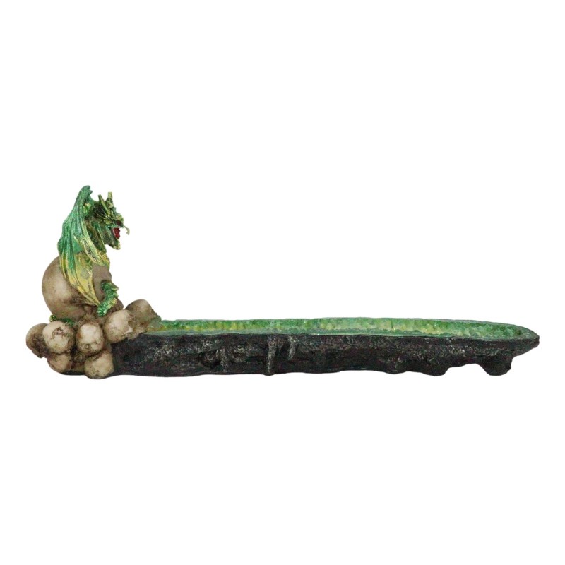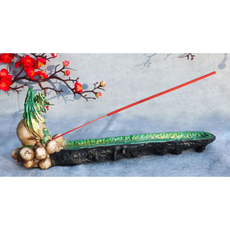 • This is a beautiful semi shiny bright green dragon incense holder that features a guardian drake towering over a giant skull near a river quarry of crystal green geode emeralds. Burn your incense sticks with great style and get rid of those mundane old fashioned incense holders!