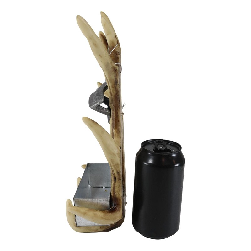 - This Entwined Deer Antlers Wall Mounted Bottle Opener is approximately 11.5" tall and 6.5" long and 3" deep. It is designed to hang on the wall. The wall sculpture weighs about 1.75 pounds. It is recommended to anchor your walls prior to hanging this bottle opener. Hanging hardware not included.