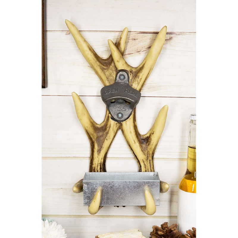 - Spruce up your western rustic decor with this entwined antlers trophy wall mounted bottle opener. Two hand crafted and painted faux antlers are mounted together in criss-cross style. In the center of the sculpture is a vintage style metal bottle opener and at the bottom is a catcher basin for the caps. It is perfect for you and your guests. Opening your soda or beer bottles have never been easier and more convenient!