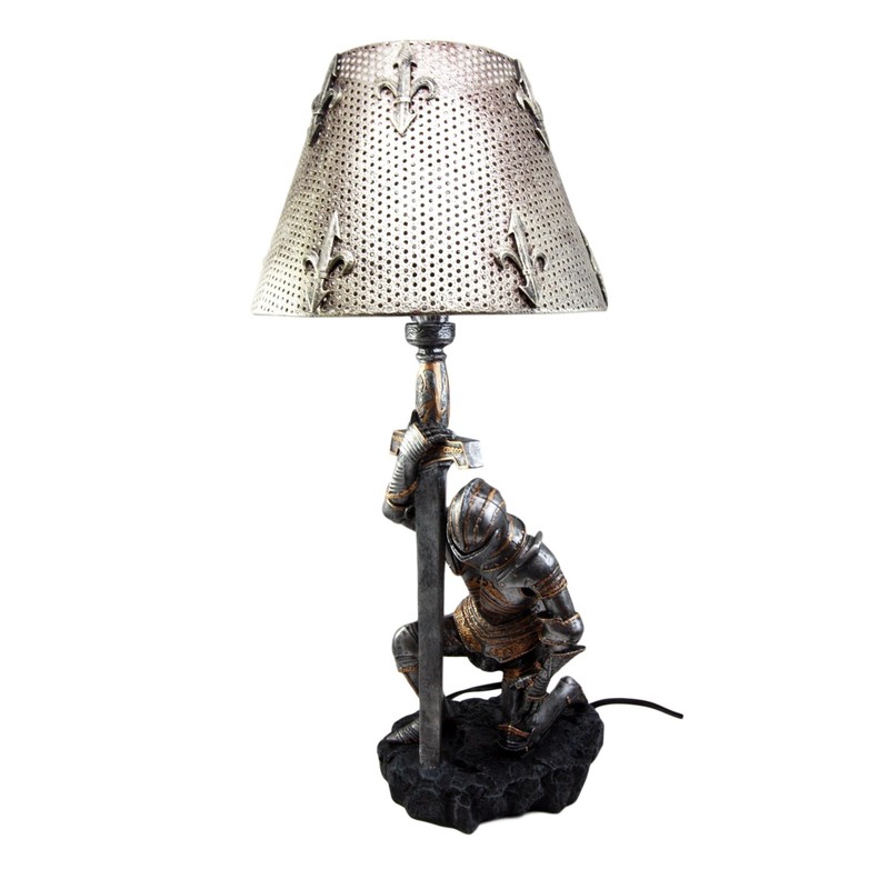 - Looking for a medieval touch to your living room or bedroom? This kneeling knight side lamp is perfect for you!!! This chivalrous knight kneels on one knee waiting to be dubbed with honor. The lamp is corded and takes one 40 watt bulb or CFL/LED equivalent. It comes with a convenient ON/OFF switch on the cord.