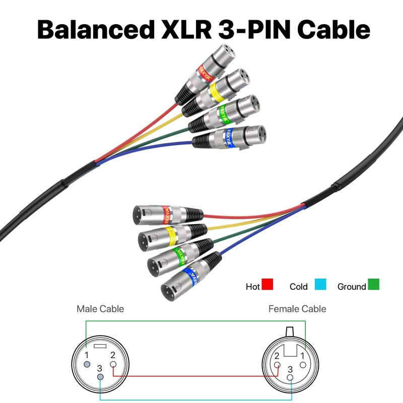 - [Colored 3-Pin Snake Cables] The 4-channel XLR snake is designed in 4 different colors (red, yellow, blue, green) to help you easily trace microphones, mixing boards and other connectors. The speaker cable can be used with any device equipped with a 3-Pin XLR female to male
