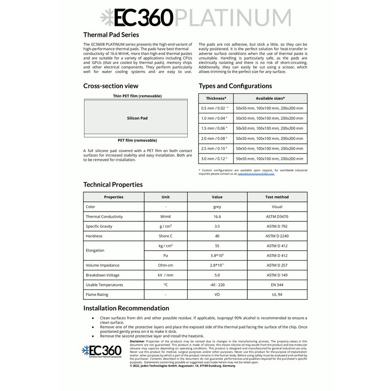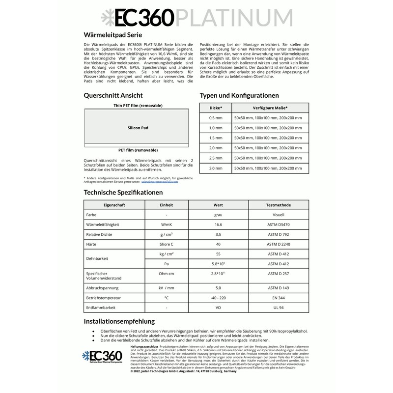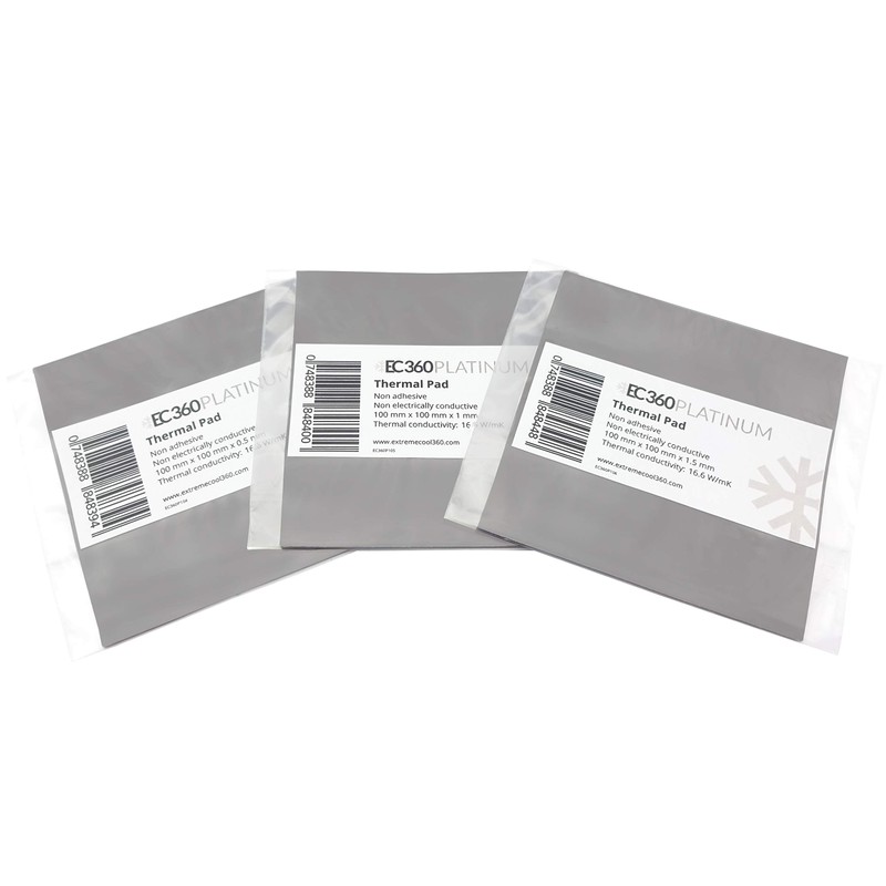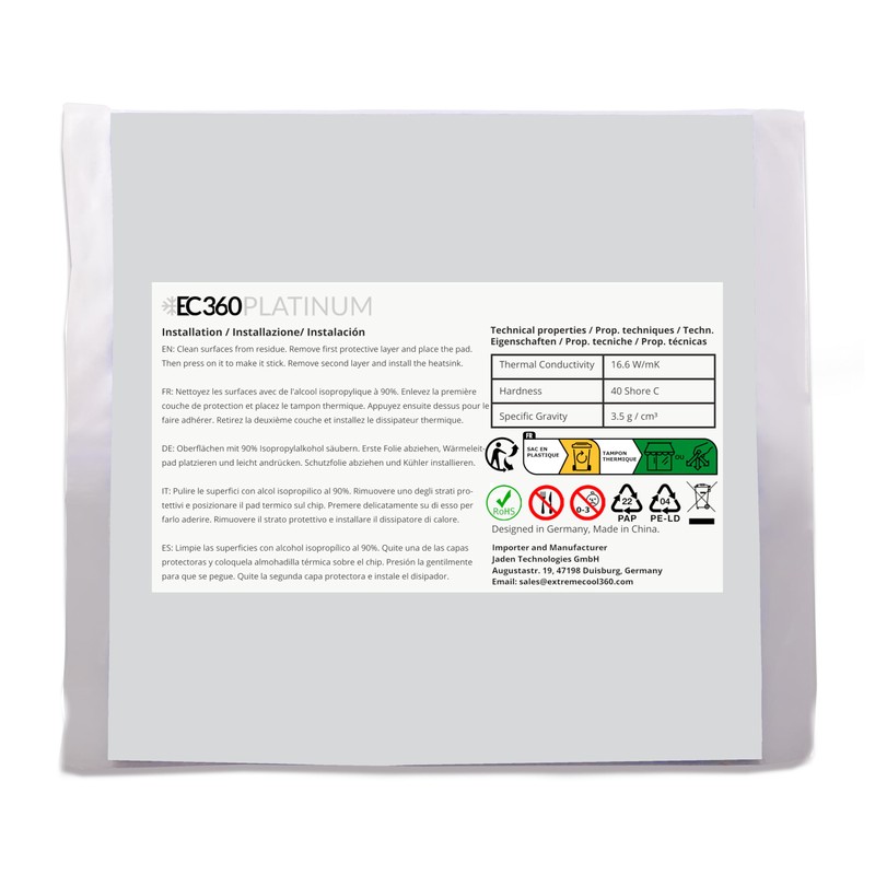 The thermal pads of the EC360 Platinum series form the absolute top class in the highly heat-conductive segment. With the highest thermal conductivity of 16.6W/mK, they are the best possible choice for any application, better than high performance thermal pastes.
