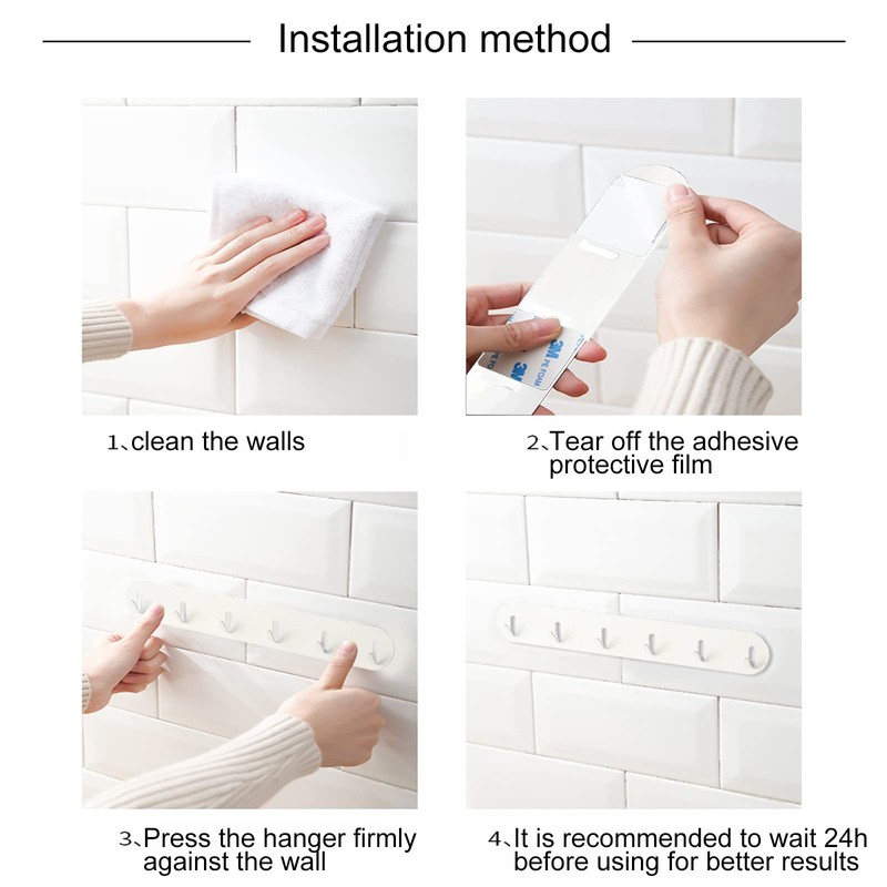 - 『Easy to Install』1 Clean the walls. 2 Tear off the adhesive protective film. 3 Press the coat hanger firmly against the wall. 4 It is recommended to wait 24h before using for better results.