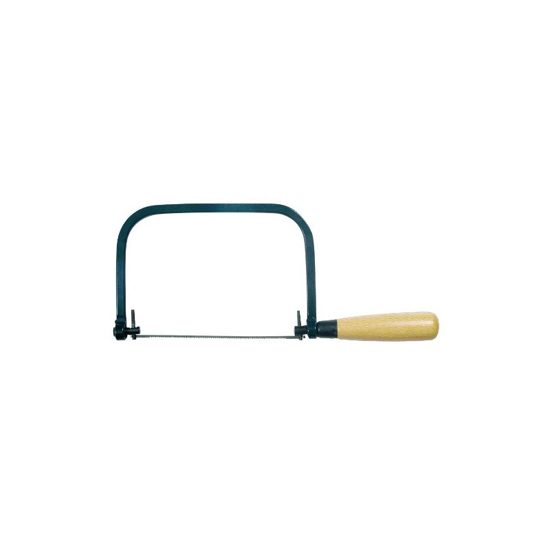 Wood handle coping saw for cutting and shaping in wood. Blades can be positioned at any angle to the frame.