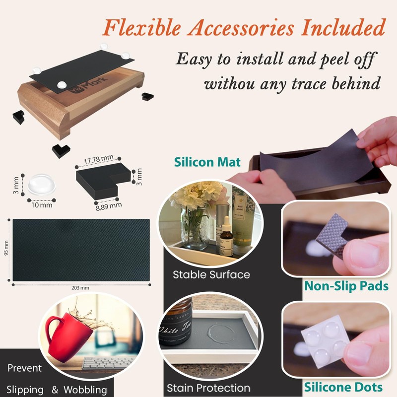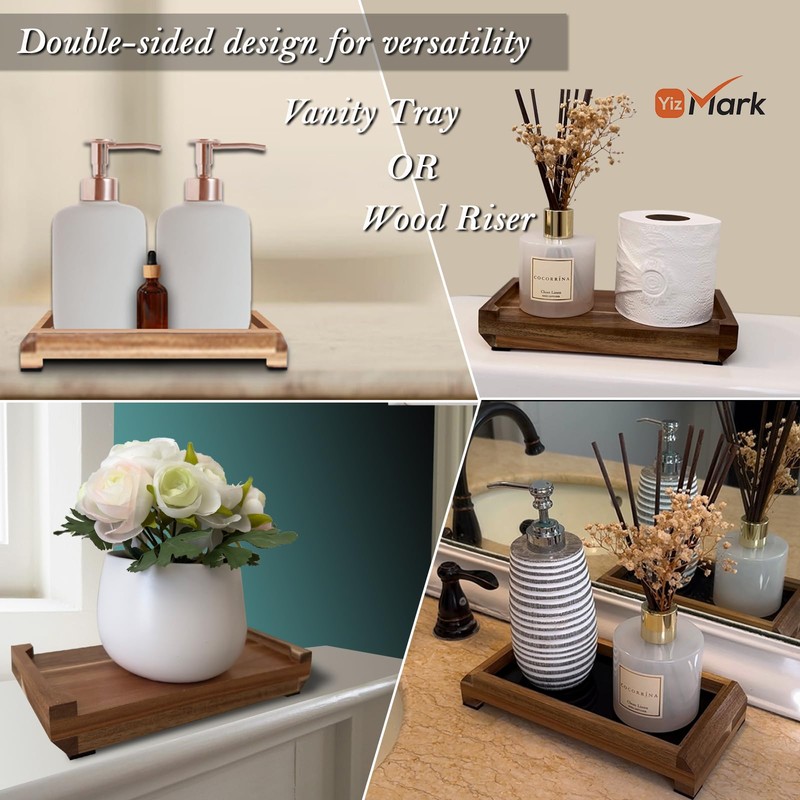 Eco-Friendly Solid Wood Bathroom Vanity Tray, Decorative Riser with Silicon Mat, Adhesive Pads, Dual-Sided Usage