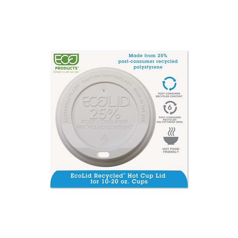 Help keep waste out of landfills with this hot cup lid. Made from 25% post-consumer recycled polystyrene yet performs as well as traditional lids made from virgin plastic. Fits: 10-20-oz. Hot Cups; Material(s): Plastic; Color(s): White; For Use With: Eco-Products Evolution World Hot Cups.