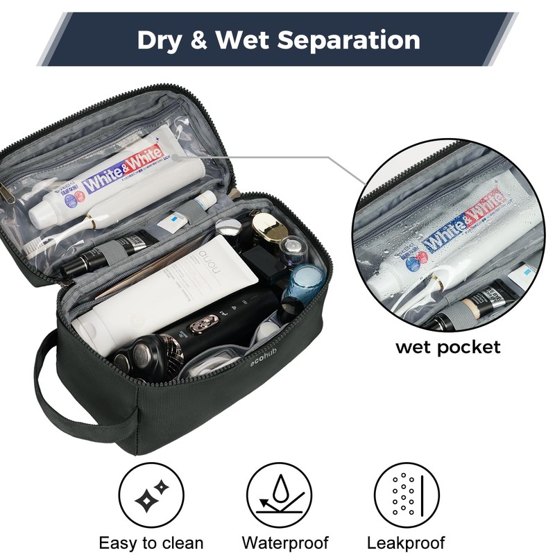 ECOHUB Toiletry Bag for Men, Waterproof Travel Toiletry Bag, Wash Bag with Dry/Wet Bag, Cosmetic Bag Men with Double Zip, Patent Pending, Army Green, L