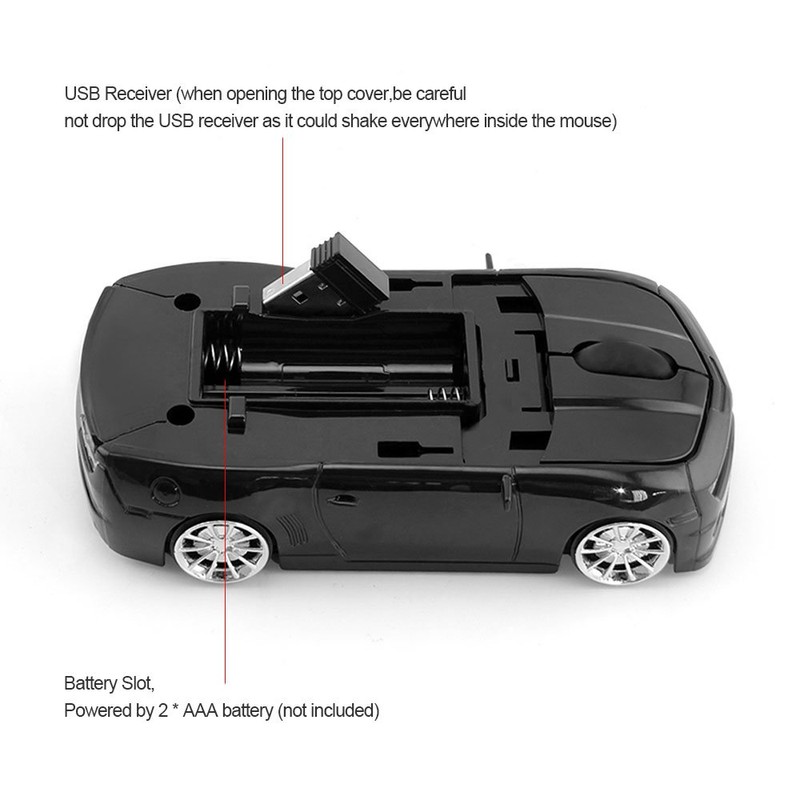 • 【Plug & Play】: The car shaped mouse is very easy to install. Simply slide the car roof cover to find out the USB receiver, connect the USB receiver, plug in a 2 x AAA battery (not included) and then turn on