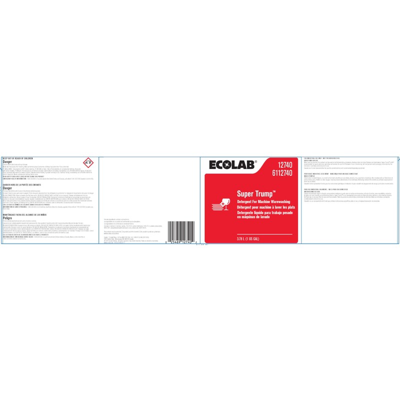 ECOLAB Super Trump is a concentrated, high-alkaline, heavy duty liquid detergent for Machine Warewashing. It can be used for Bar Glass Washing, Automatic Duct Cleaning Systems And can be automatically dispensed directly from the shipping container. The concentrated, high-alkaline formula strips away heavy grease, protein, and starch food soils that ordinary detergents can miss and is effective in light, medium, and heavy soils conditions. It also contains special water conditioning agents to help reduce spotting and streaking.
